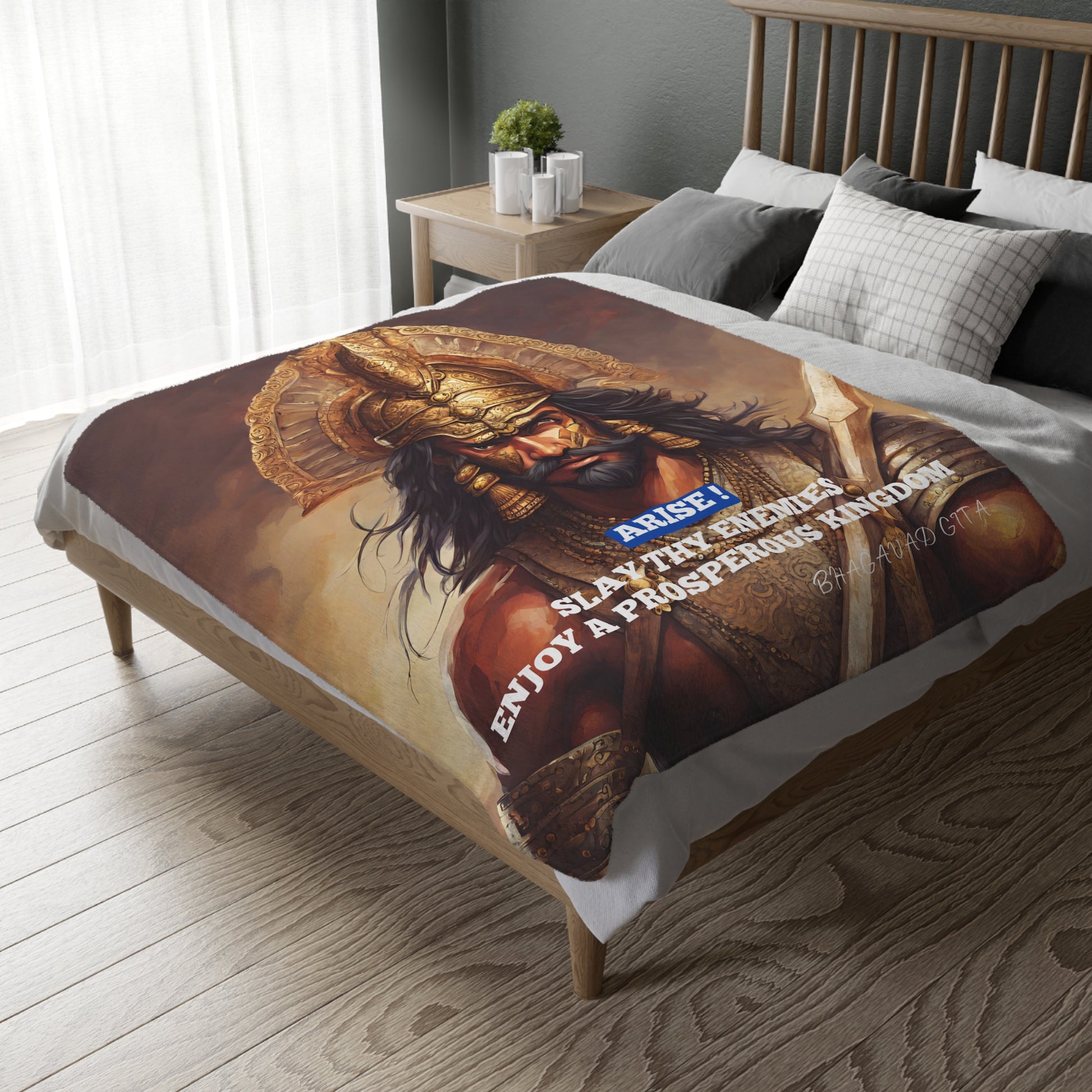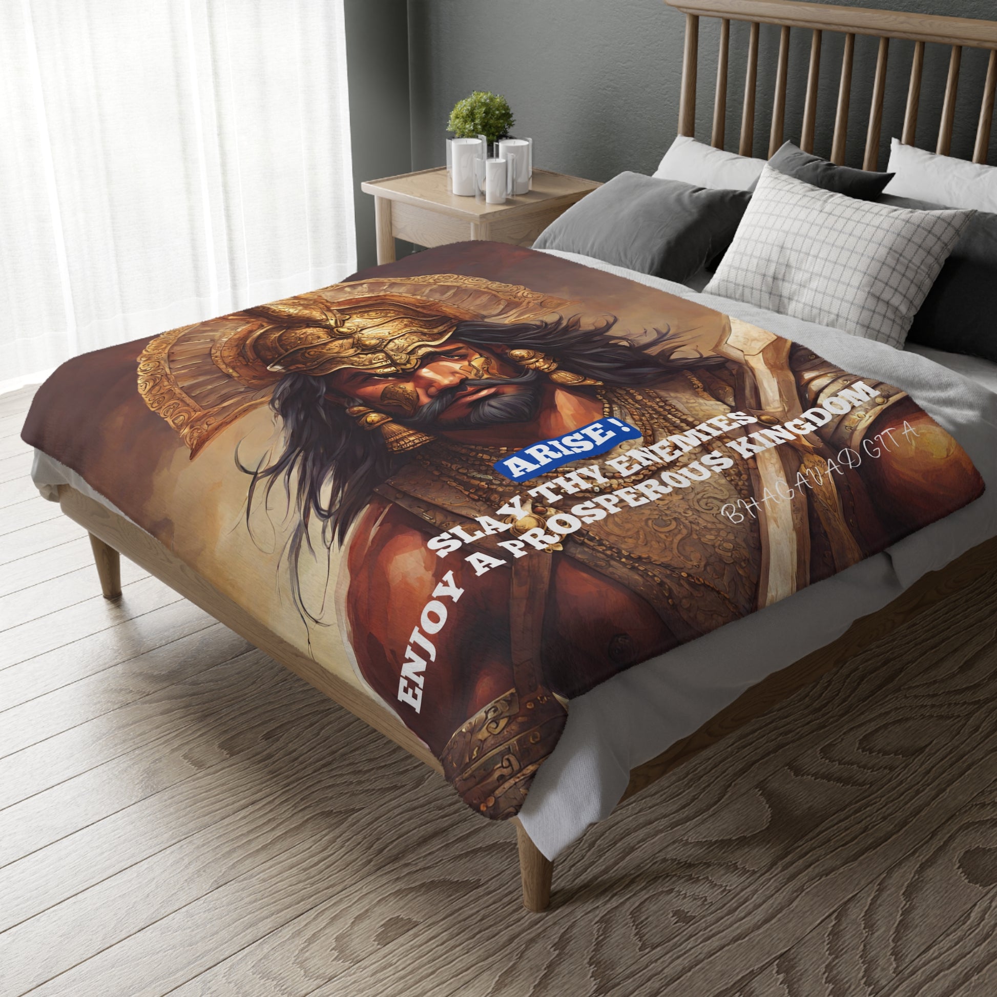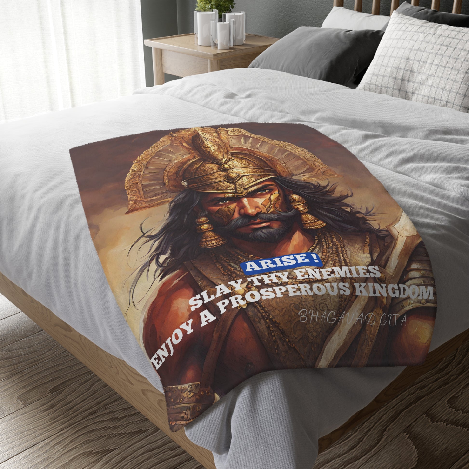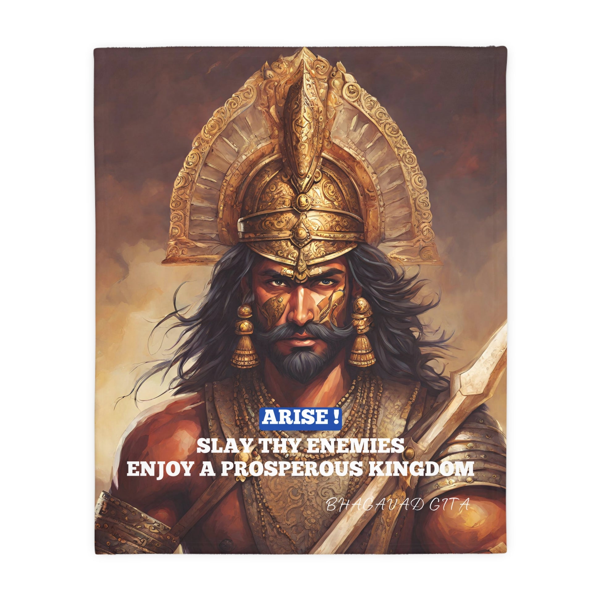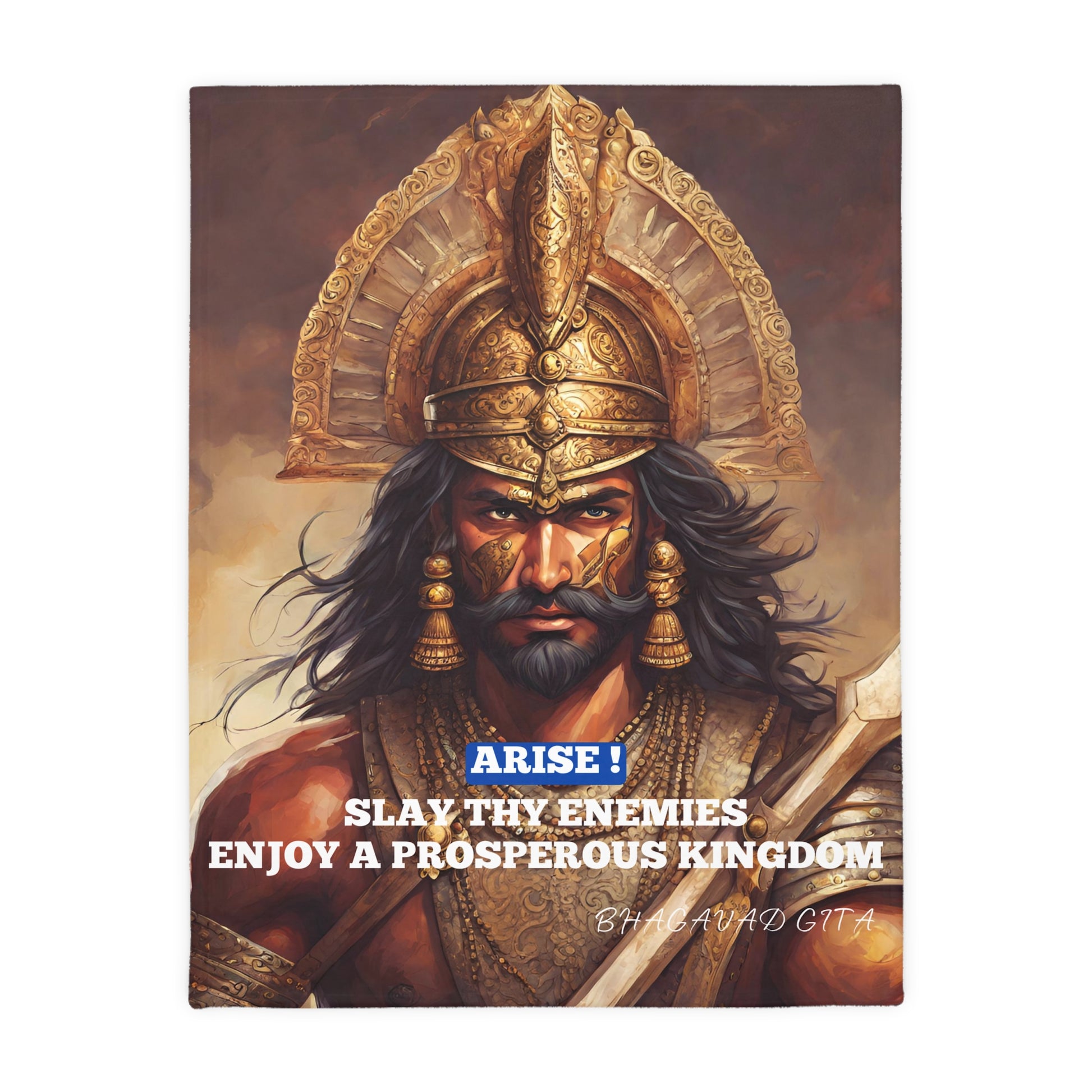 Emblazoned with the empowering words "Arise! Slay thy enemies. Enjoy a prosperous kingdom", this blanket serves as a reminder of the call to action and resilience found within the sacred verses of the Bhagavad Gita. As you wrap yourself in its gentle embrace, let these words resonate deep within, igniting the flames of determination and fortitude. Whether you're seeking solace during moments of contemplation or simply indulging in moments of relaxation, this blanket becomes a sanctuary, enveloping you in both physical comfort and spiritual inspiration.