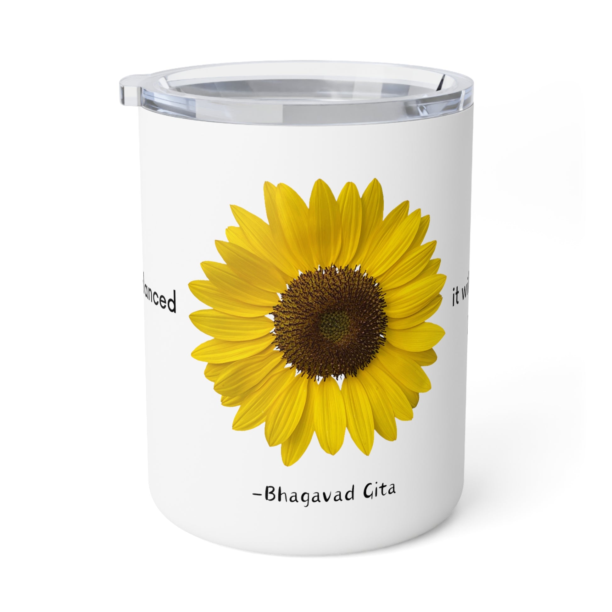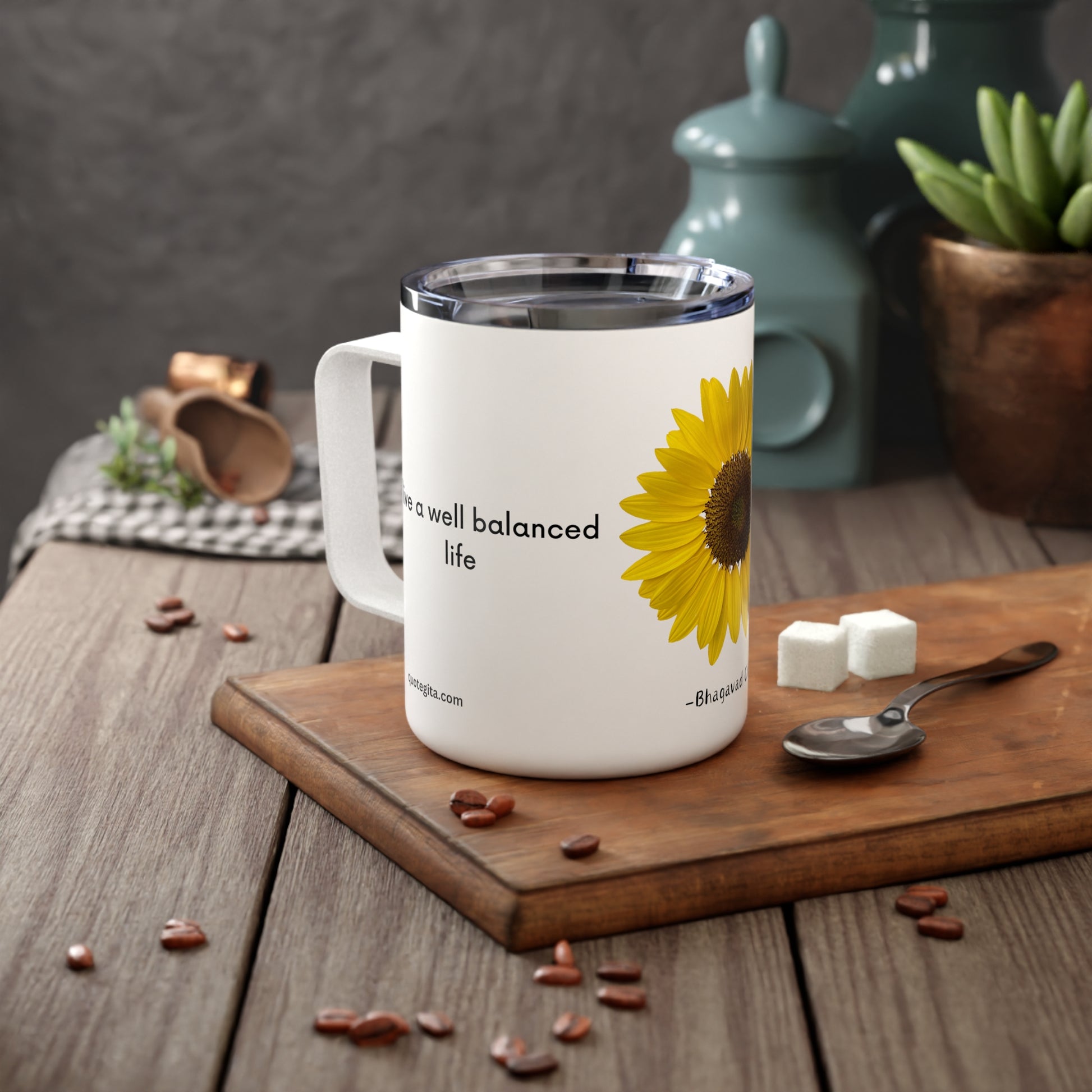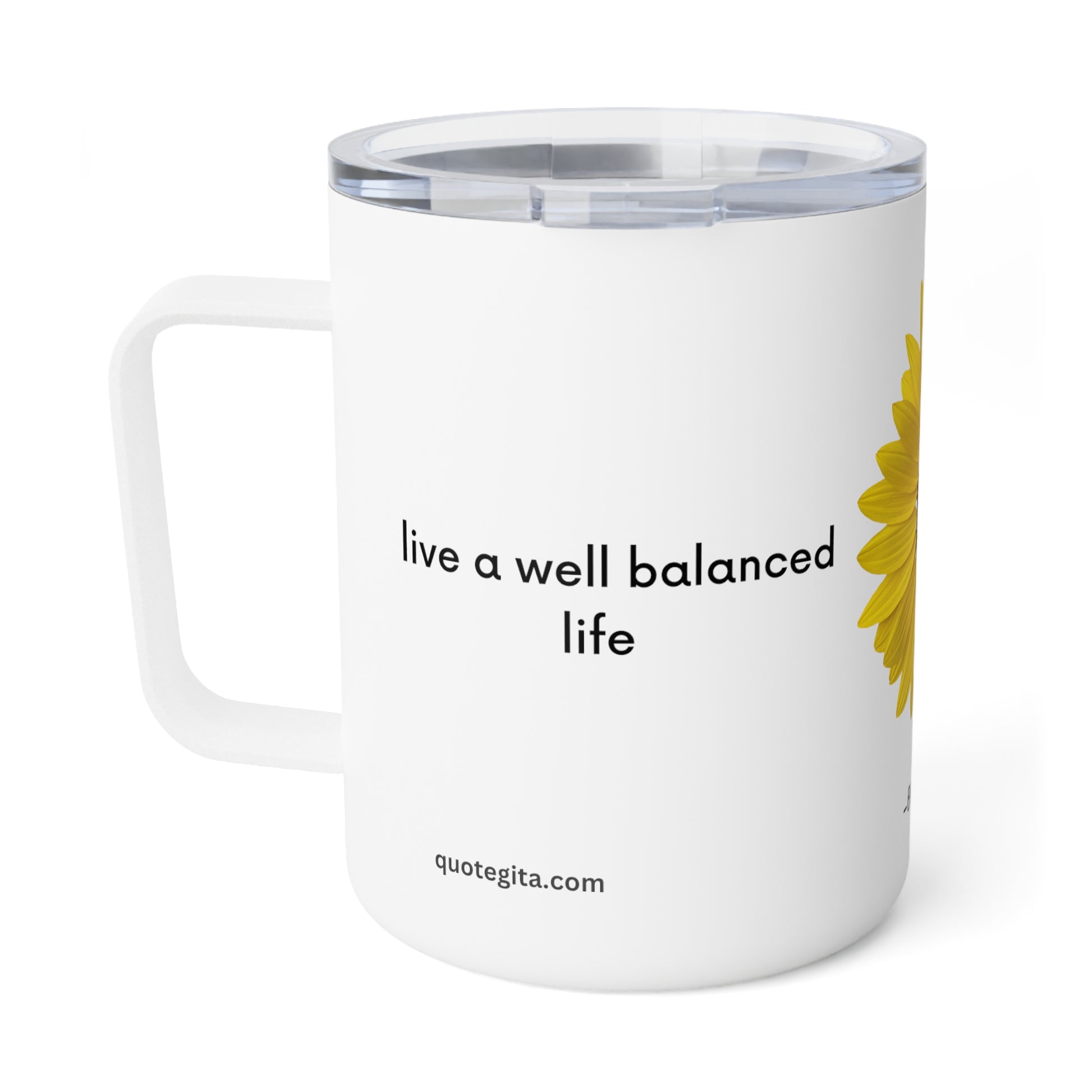 Embrace the wisdom of the Bhagavad Gita with a soothing quote. Nothing like a refreshing sip of one's favorite beverage in the middle of a long adventure - whether it's your morning coffee, herbal tea, or favorite hot beverage. Adorned with the timeless words from the Bhagavad Gita, "Live a well-balanced life. It will bring you peace," this blanket serves as a gentle reminder to seek harmony and equilibrium in all aspects of life.